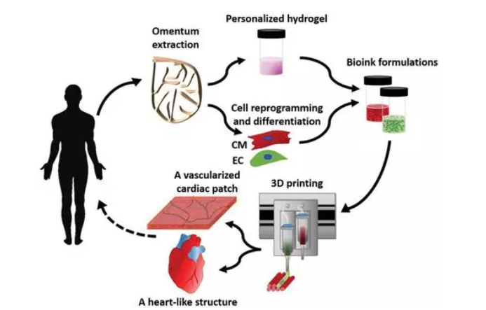首先,研究团队会对患者的脂肪组织进行活组织检查,分理处其中的细胞,将它们重编程成多能干细胞。同时,利用细胞外基质(主要是胶原蛋白、糖蛋白)合成个性化的“水凝胶”。