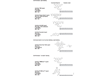 Alexa Fluor® 488 Ligand不能穿透细胞膜,用于标记细胞表面蛋白。TMR Ligand, Oregon Green® Ligand, diAcFAM Ligand 和Coumarin Ligand容易透过细胞膜,用于标记细胞内蛋白。
