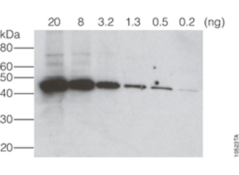 The blot was performed on a serial dilution of lysate; each lane contains an indicated amount of β-actin (ng) as quantitated via ELISA. Primary antibody (monoclonal) used at 1:5,000, Anti-Mouse IgG, HRP Conjugate secondary antibody (Cat.# W4021) used at 1:2,500; blot imaged with ECL Western Blotting Substrate(Cat.# W1015) and with 1-minute exposure.