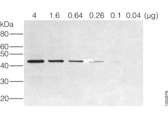 • 灵敏:比4- 氯-1- 萘酚(CN) 至少灵敏3 倍;当使用β- 半乳糖苷酶的特异性抗体及HRP- 共轭的二抗时,在TMB 印迹中可以检测到少至412pg 的β- 半乳糖苷酶,而在CN 印迹中却可以检测到1.12ng。