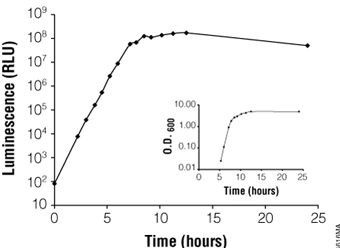 使用BacTiter-Glo™试剂接种细胞后立即评估细菌的生长。当使用吸光度值(O.D)检测细菌生长时,出现第一个显著的读值(0.25 O.D., E.coli)的时间是在接种后5小时。