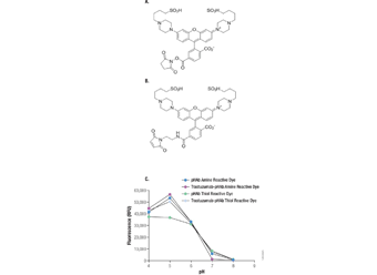 pHAb染料的关键特点是每个染料都有2个磺化基团,能够增加可溶性并降低非磺化染料常见的聚集现象。即使在与抗体结合后,pHAb染料仍保持有对pH变换的反应,如图1, C所示。虽然抗体标记是pHAb染料的主要的应用,但是任何带有赖氨酸伯胺基或者半胱氨酸硫醇的蛋白均可结合pHAb染料。