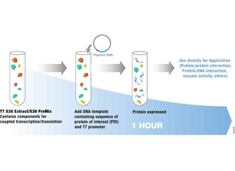 • 更快地获得数据:在 1 小时之内可表达出蛋白,而不像体内表达那样需要几天的时间。