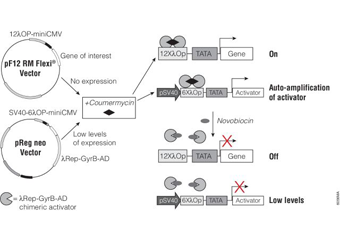 纳摩尔浓度的抗生素香豆霉素即可引发嵌合反式激活蛋白同型二聚体的形成,接着与位于驱动转录目标蛋白编码序列的最小启动子上游的λ 操作子序列结合。蛋白表达水平可以通过调节香豆霉素的浓度来控制。更重要的是, 这一表达可以通过加入新生霉素而被迅速有效地关闭,新生霉素作为拮抗剂,可将反式激活蛋白二聚体解离。可控哺乳动物表达系统之所以适合基因表达的体内调控,在于引入哺乳动物细胞中的两种特别设计的质粒以及直接加入到培养基中的调控化合物-香豆霉素和新生霉素。
