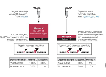 Figure 1. Side-by-side comparison of cleavage sites missed by trypsin or Trypsin/Lys-C Mix using a standard digestion protocol.