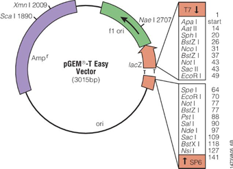 . 灵活:pGEM®-T Easy 载体多克隆位点两侧分别有BstZI, EcoRI和NotI 酶切位点,便于通过选择单酶切释放插入的DNA。
