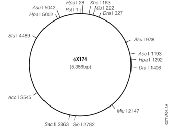 二十面体噬菌体ΦX174 的复制型(RF) 是一个5,386 碱基的双链环状DNA 分子。用凝胶分析核酸时,限制性酶消化的ΦX174 DNA 可以用作分子量大小的标记。ΦX174 DNA 经常用于检测存在缺口酶活性的限制性酶。