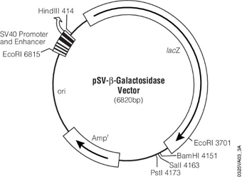 pSV-β- 半乳糖苷酶对照载体可与您的目的 DNA 共转染。例如,如果将该载体与萤火虫萤光素酶基因载体(pGL3 载体)进行共转染,能够同时检测细胞提取物中的萤光素酶和 β- 半乳糖苷酶的活性。在这种情况下,pSV-β- 半乳糖苷酶载体作为瞬时表达检测的内对照。实验也应检测阴性对照提取物,用于判定细胞培养物中有无内源性 β- 半乳糖苷酶,该阴性对照提取物由假转染的细胞制备而来。此外,共转染氯霉素乙酰转移酶报告基因载体(pCAT® 3 载体),就能够检测 CAT 和 β- 半乳糖苷酶的活性。pSV-β- 半乳糖苷酶载体是由 pRSV-β-Gal 改造而来,将 SV40 和 pUC18 序列取代了 RSV 和 pBR322 序列。pSV-β- 半乳糖苷酶载体可在 E.coli 内表达 pSV-β- 半乳糖苷酶,因为 lac Z 基因的上游为 E.coli gpt 启动子。带有 pSV-β-半乳糖苷酶载体的 E.coli 克隆在含有 X-Gal 的培养基上呈蓝色。